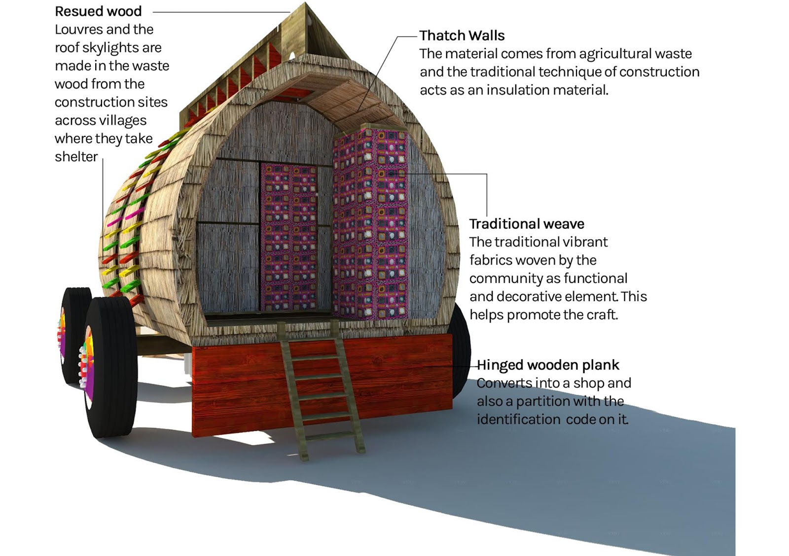 This movable tiny house does not mean to innovate by transforming the current habits of the Kalbelias. Rather, it is based on their existing traditions and architectural customs, from which derive the innovations. The design is meant to evolve over the years to adapt itself to the changing economic and living conditions of the community and therefore allow them to grow.
